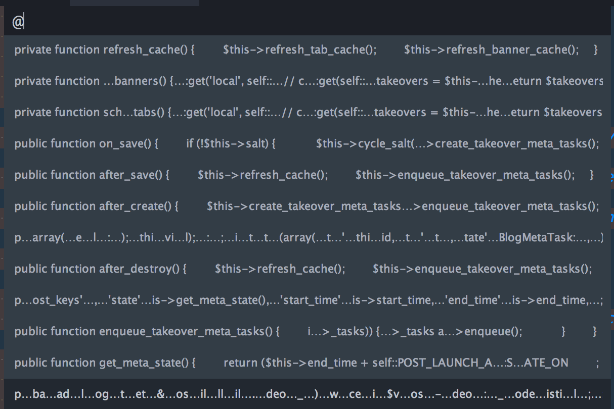 After upgrading to 3114 in my PHP app the symbol search within a file (⌘R) seems to be broken as the screenshot shows. It seems to be matching the entire method, not just the method signature.