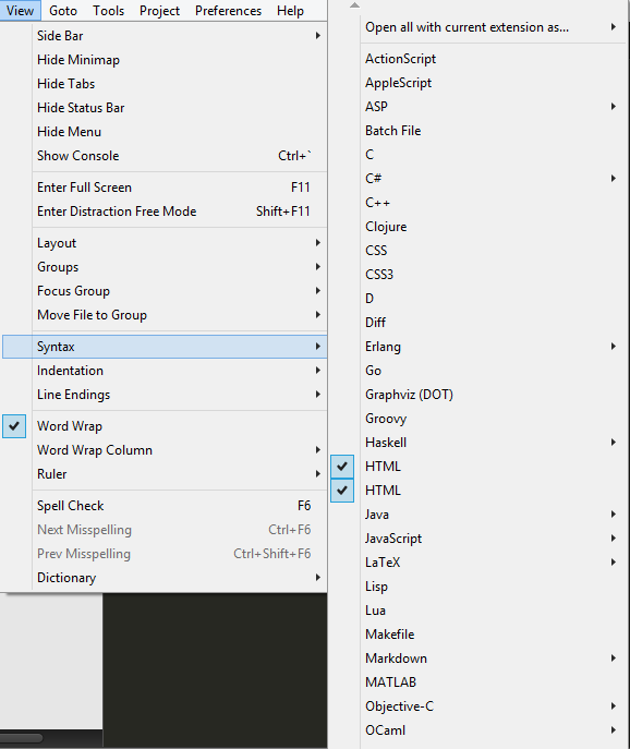 My syntax suddenly includes two HTML options and when I write in sublime text.
