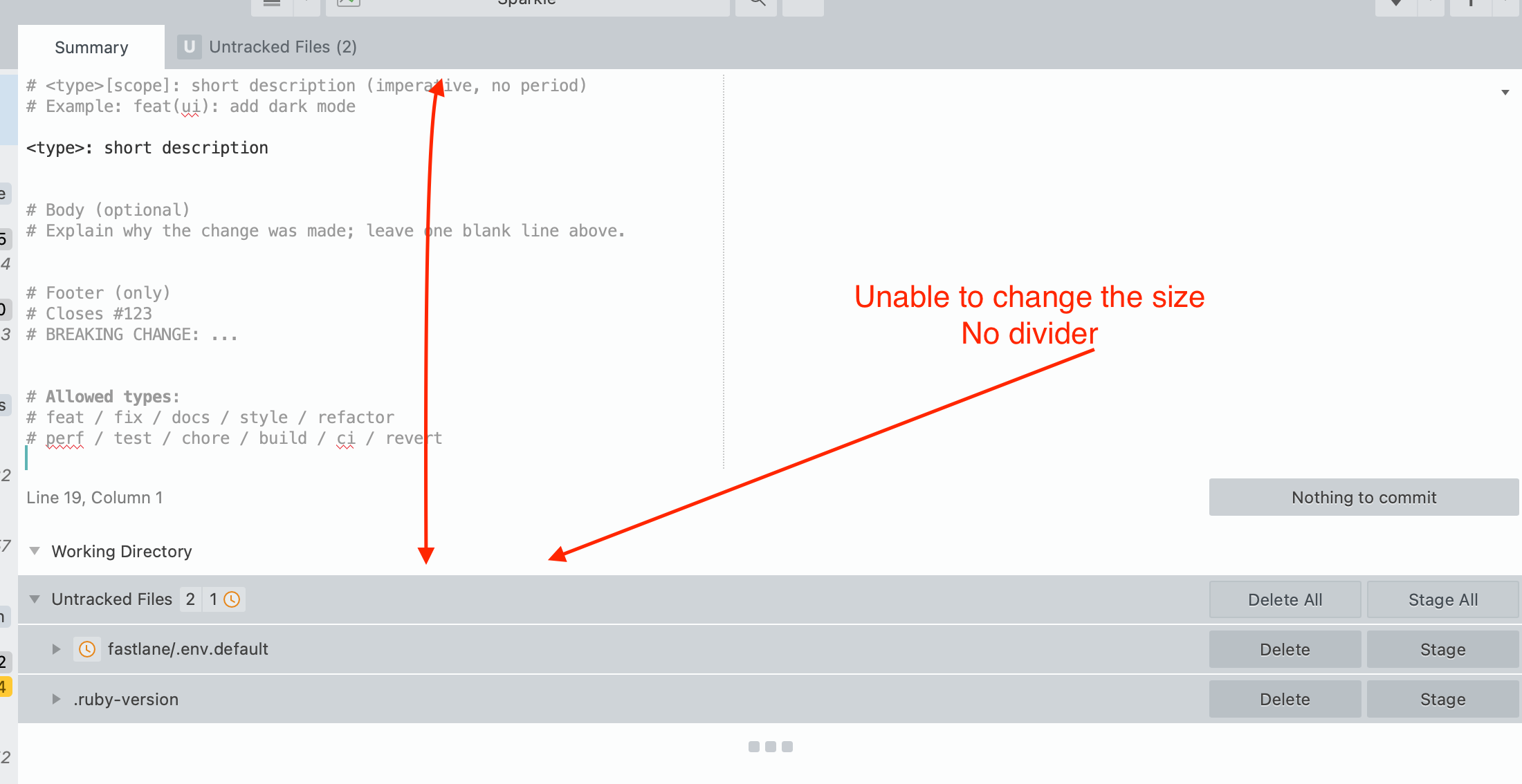 I’m working on a project with a very long .gitmessage and the height of the commit message box is too tall. I thought there was a divider, but there isn’t.