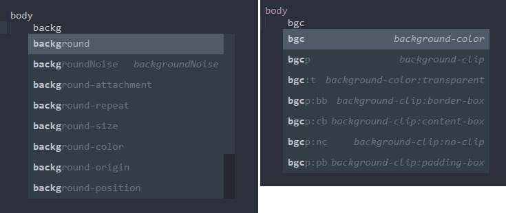 What I am looking for (CSS completions) on the left. What I am getting on the right.