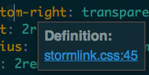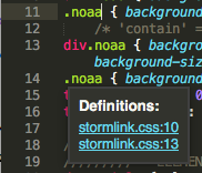 The popup is a brown rectangle, 2px SlateGray border, inside of border 10px top-bottom and 8px left-right to popup text-only content. Popup is always titled, “Definitions”. Popup title font is Arial, color white, bold 12pts, aligns left. Also, aligned left under title, there is a list, same font, color aqua, normal font weight, links only, links underline color aqua, each link on new line, each link is the filename of the file open in Sublime Text 3126: that is, the active file. Each “Definitions” link list filename is followed immediately to right of file name by a colon and then immediately followed by a random sequential whole number. By random sequential whole numbers, we mean the whole number string begins at a random whole number, and then counts a random consecutive string of sequential whole numbers up until the file-name list ends. I have seen the whole number link string begin anywhere from ‘0’ up to ‘245’. The brown popup box expands in size to exactly fit the “Definitions” title, and beneath title the ‘filename:number’ list, with text margins as noted.