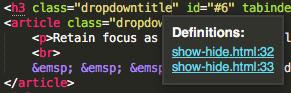 When the cursor enters the double-quotes of HTML built-in attribution, for example cursor moves into or over quotation for class=“anydata” or style=“anydata”, then the popup occurs. Behavior is immediately reproducible. Popup ‘filname:number’ links are all active. When any link is clicked, then the open active file containing the clicked ‘filename:number’ link auto-closes Sublime Text tab, and new file with identical file contents opens new tab with name ‘filename:number’ on desktop of Mac Pro, with filename extension of the closed file. For example, while editing file show-hide.html, mouse hovers inside double-quotes for attribute class=“dropdown”: immediately "Definitions popup appears and under title are two links, ‘show-hide.html:32’ and ‘show-hide.html:33’. We click link ‘show-hide.html:32’ and the show-hide.html file tab in Sublime Text 3126 slams shut, instantly replaced by a new tab “show-hide.html:32” and a new file appears on desktop named “show-hide.html:32.html.html”. The ST3 desktop file creation is immediately manually deleted. Original file is checked and appears okay, but content is copied, original file deleted, and replacement in original folder. Apple, shrugs, “Ask Sublime.”