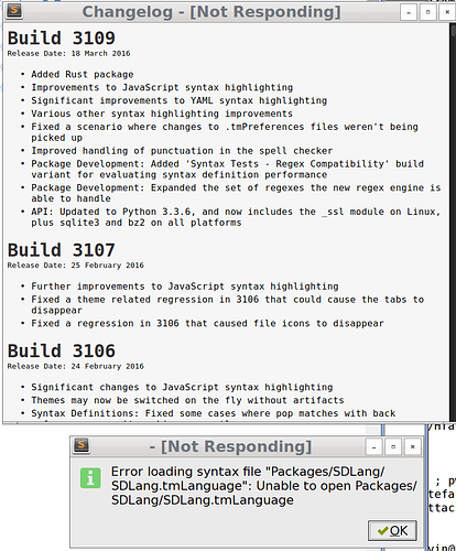 I just upgraded to build 3109 and I’m unable to start sublime. There is a package referring to a defunct SDL language definition file I had been meaning to get rid of, and I always needed to click on the dialogue after starting up sublime. Then I think I need to click on the changelog to make it disappear. But, possibly because of interaction between the windows, I cannot dismiss either one, and neither of the windows respond, so this build as it stands is unusable for me.