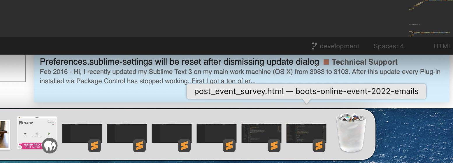 After updating to the latest version of Sublime Text, each folder/file in my dock bar are no longer showing previews/text of which project they are when opening Sublime Text again, after quitting. (the previews icons in the dock also don’t show the code, they are just blank windows)
