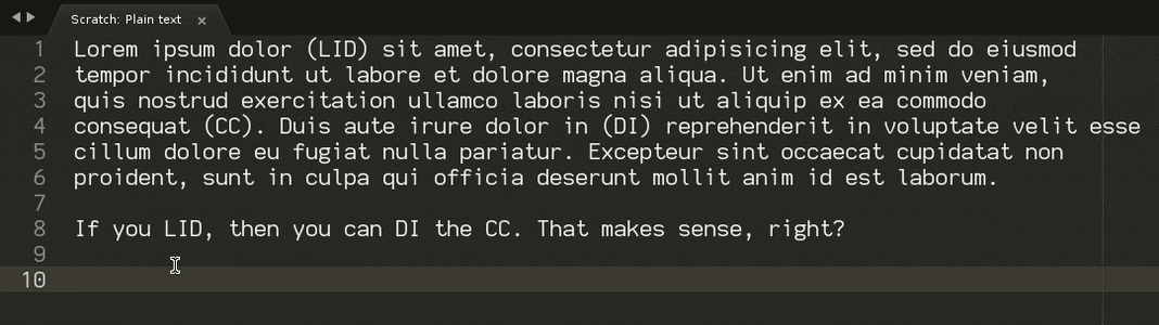 To use this you also need to create a sublime-commands file such as AcronymMode.sublime-commands as well, with the following content. The name of the file doesn’t matter as long as the extension is correct; you want to put it wherever you put the plugin.