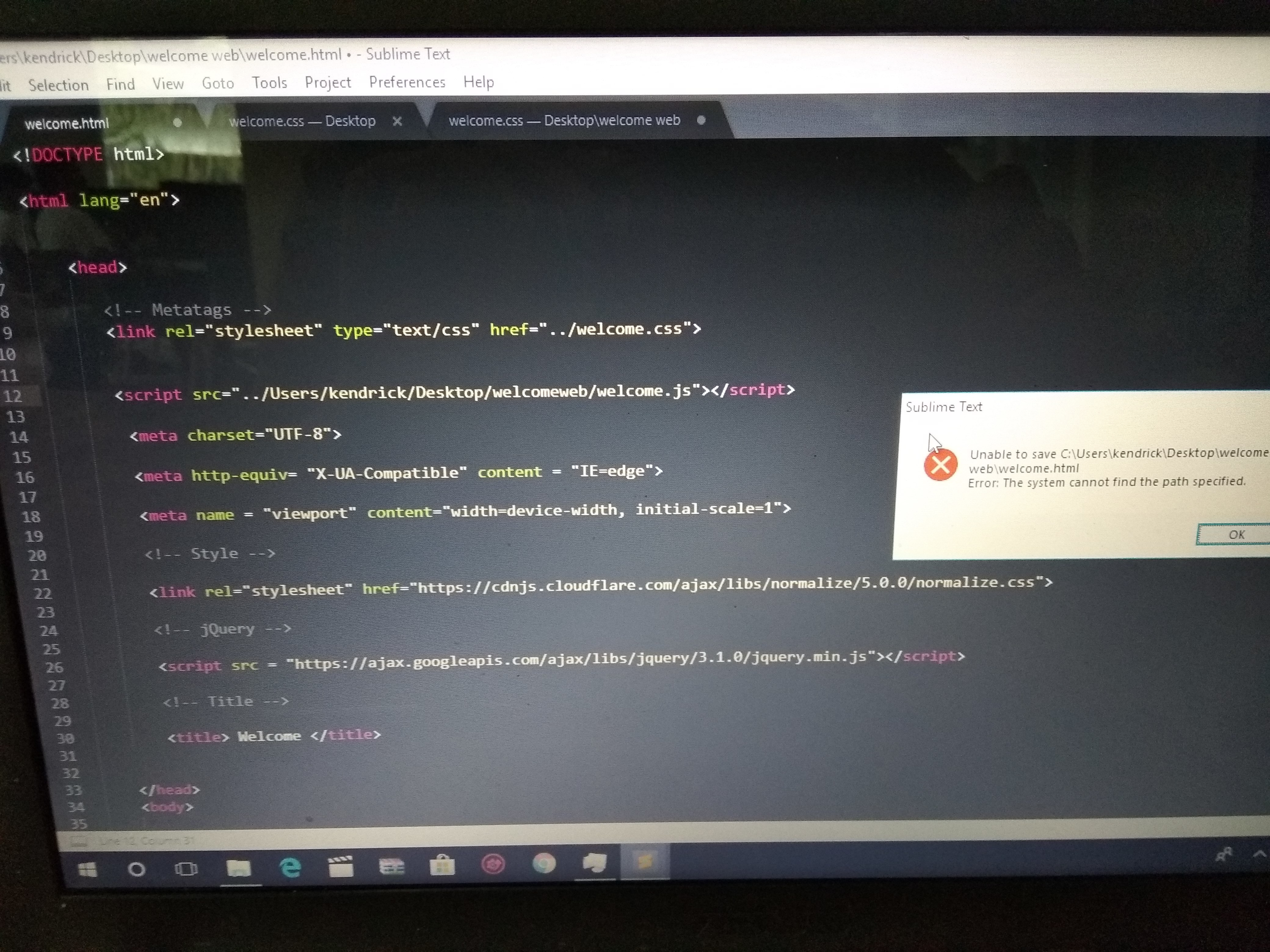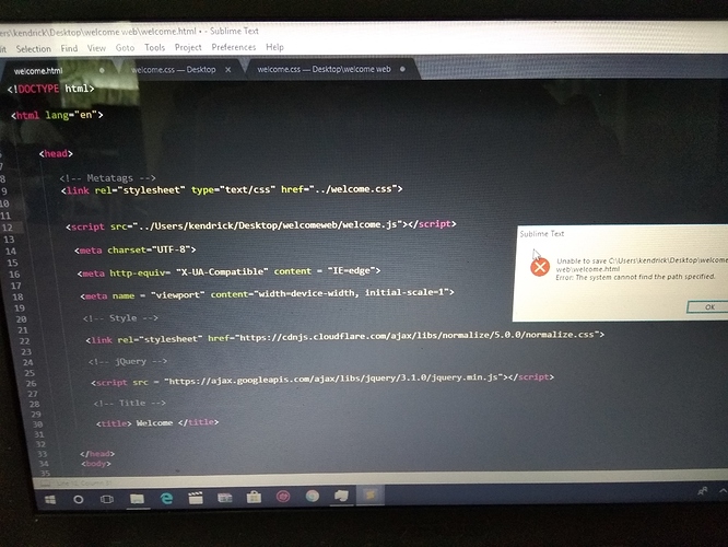 o este con un espacio. Si te fijas en wolcome.css en la tercera pestaña verás que el directorio al que señalas es “welcome web” con un espacio.