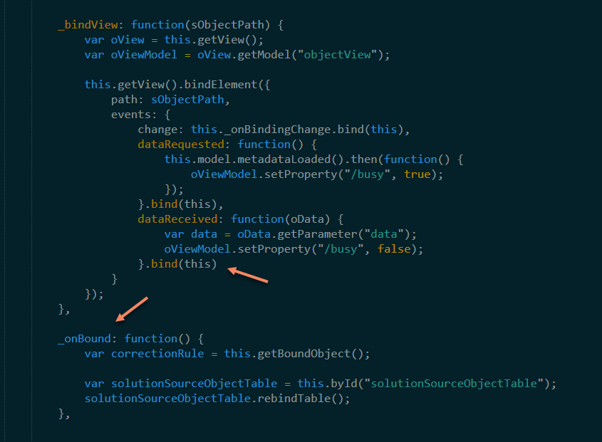 _bindView: function(sObjectPath) { var oView = this.getView(); var oViewModel = oView.getModel("objectView"); this.getView().bindElement({ path: sObjectPath, events: { change: this._onBindingChange.bind(this), dataRequested: function() { this.model.metadataLoaded().then(function() { oViewModel.setProperty("/busy", true); }); }.bind(this), dataReceived: function(oData) { var data = oData.getParameter("data"); oViewModel.setProperty("/busy", false); }.bind(this), } }); }, _onBound: function() { var correctionRule = this.getBoundObject(); var solutionSourceObjectTable = this.byId("solutionSourceObjectTable"); solutionSourceObjectTable.rebindTable(); }});