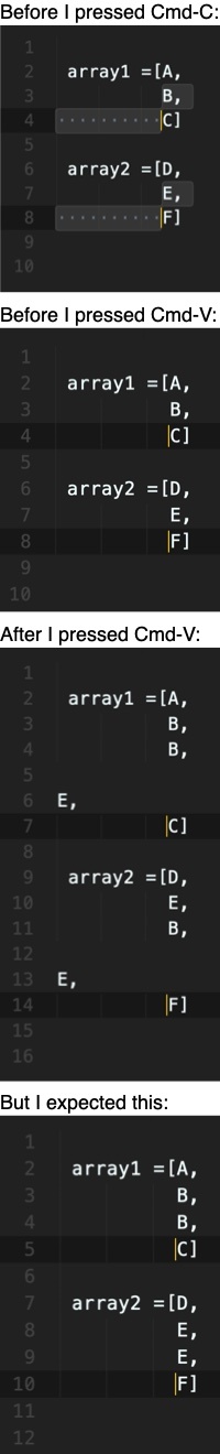 This problem first appeared somewhere around 3193 or 3194. When I use multiple cursors to copy/paste, it pastes more than expected. Below is a single pic I put together with a progression of screen shots to show the problem: