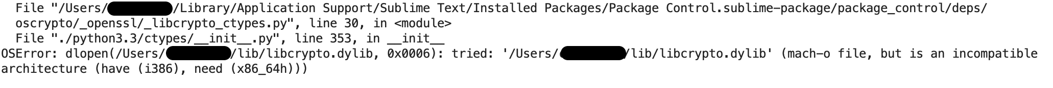 Hello, I’ve installed Package Control but it doesn’t show in the Command Palette. I checked and Package Control isn’t on my ignore list. I confirmed that Package Control.sublime-package is in my Installed Packages. I’m using a Mac on macOS version 12.6. There’s an error in my console that I think is causing the issue. Any idea how to fix?