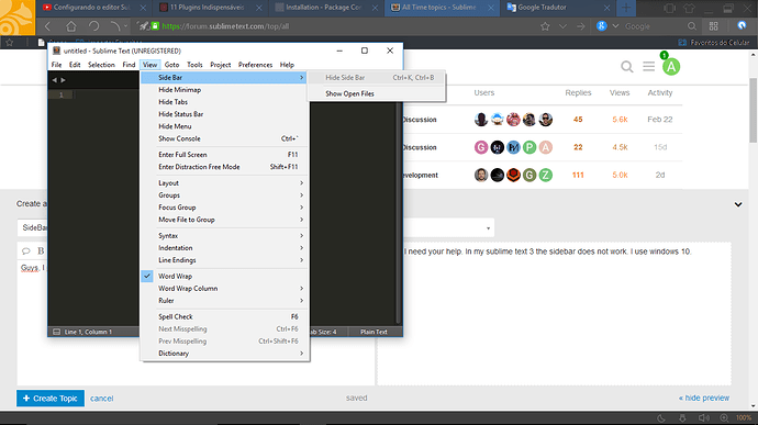 Guys, I need your help. In my sublime text 3 the sidebar does not work. I use windows 10.