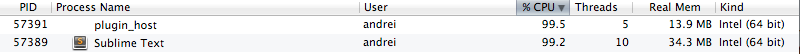 Having never used Sublime Text before I decided to give it a shot and downloaded the latest ST3 build. After installing it and starting ST3, I see that it’s consuming a 100% of one of the cores in my MacBook Pro.