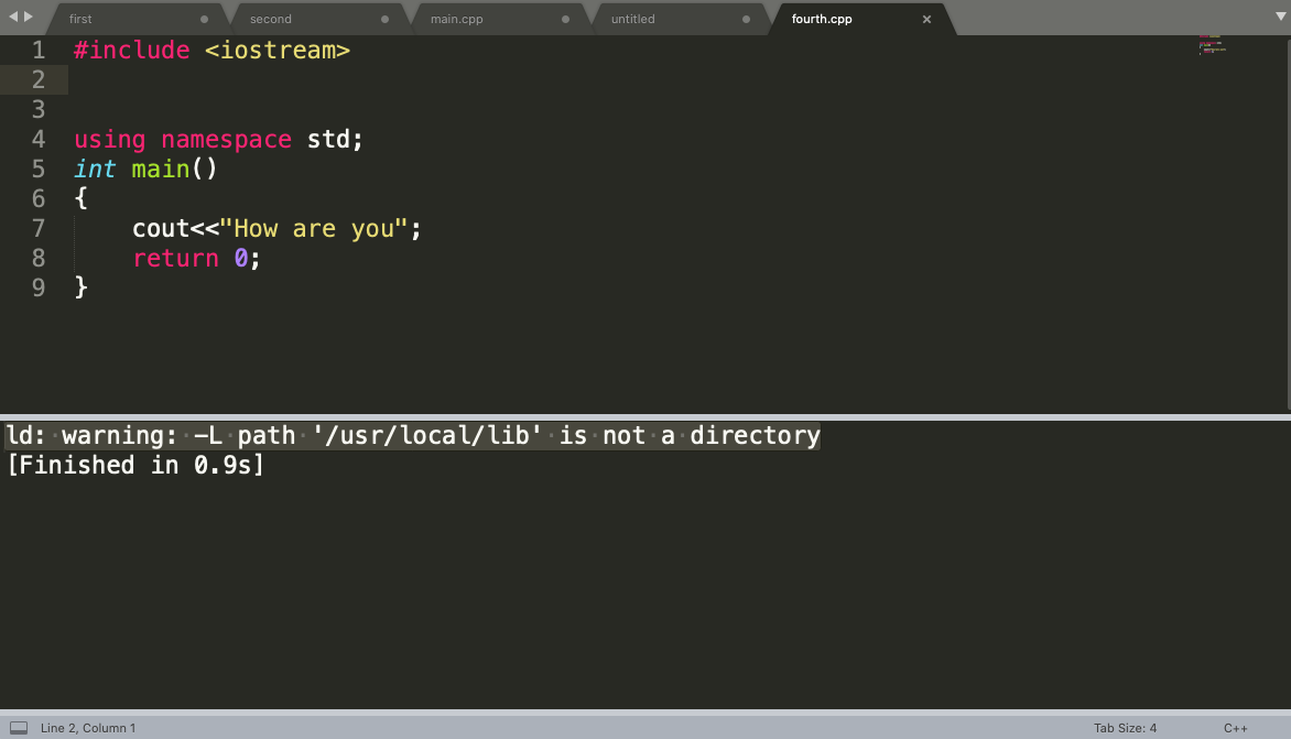 In sublime text 3 whenever I write a programme and look for its output I get this error ld: warning: -L path ‘/usr/local/lib’ is not a directory