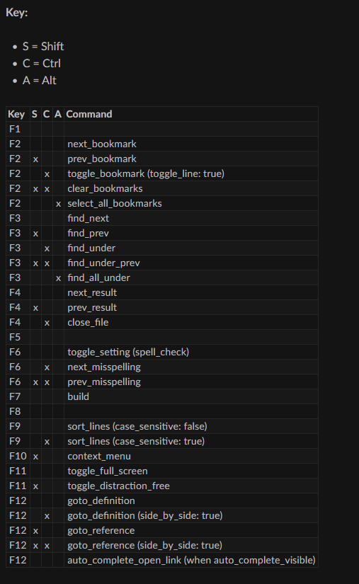 I have looked and looked and have not yet found a Sublime Text Package that can generate a table of existing key bindings, so I can look for “areas” of the keyboard that have not yet been used. Here is what I am looking for (I constructed this one by hand, from the Default (Windows).sublime-keymap that comes with Sublime Text build 4200).