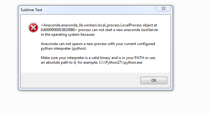 This is probably best directed to the authors of the Anaconda package since it’s not a Sublime issue per se, but it looks like the message is telling you that it’s trying to run python as a program and it’s not working, so you may need to either install Python on your windows machine or, if you have already installed it, either make sure it’s on the PATH or modify the settings of the Anaconda package to know where it is.